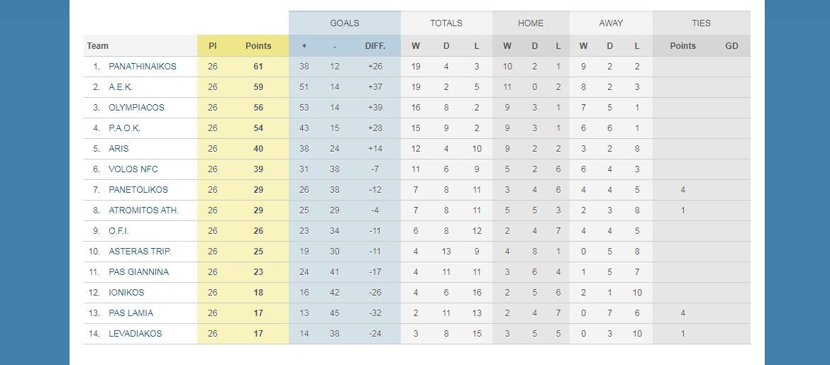 Πέραν, του παράγοντα που αφορά την διαιτησία, προφανώς και κάποια άλλα πράγματα δεν πήγαν καλά για τον Άρη, με αρκετούς “πεταμένους” βαθμούς όχι μόνο σε “μεγάλα” ματς, αλλά και σε εκτός έδρας παιχνίδια με “μικρομεσαίους”. Ρίχνοντας μια ματιά στην τελική βαθμολογία της κανονικής διάρκειας της Super League, αυτό που φαίνεται, είναι ότι υπάρχει μια σημαντική διαφορά των “κιτρίνων” σε σχέση με τους υπόλοιπους του BIG-5 αναφορικά με τα εκτός έδρας ματς. Στα εντός έδρας παιχνίδια, ο Άρης συγκέντρωσε 29 βαθμούς.