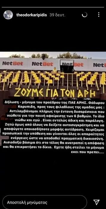 Μήνυμα στον κόσμο του Άρη έστειλε ο Θόδωρος Καρυπίδης για το -6, ζητώντας αυτοσυγκράτηση και εκφράζοντας την αισιοδοξία του πως θα ανατραπεί η απόφαση.