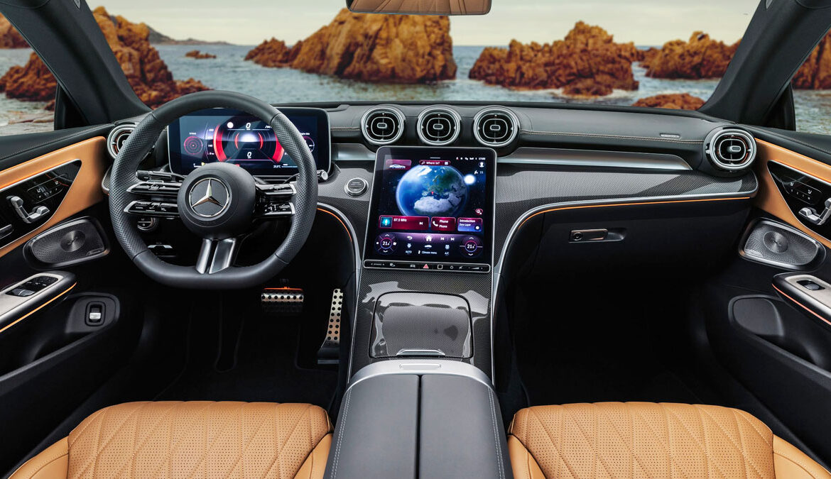 Όσο για το εσωτερικό της, το ταμπλό έχει την ίδια διάταξη με τη C-Class με μια οθόνη διαγωνίου 12,3″ για το infotainment στο κέντρο και ψηφιακό πίνακα οργάνων 11,9″.
