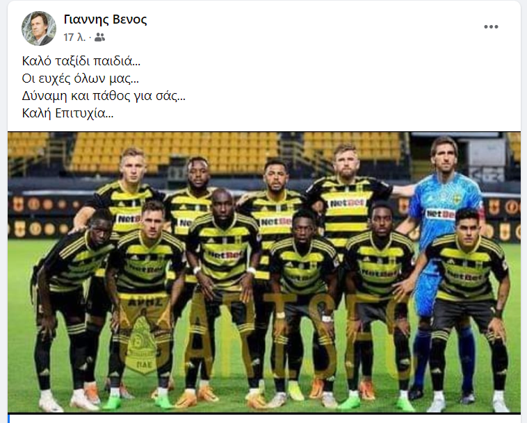 Ο πρόεδρος των βετεράνων του Άρη έστειλε τις ευχές του για τον ποδοσφαιρικό Άρη μέσα από τον προσωπικό του λογαριασμό στο facebook.