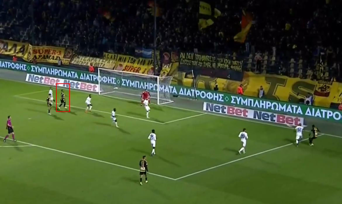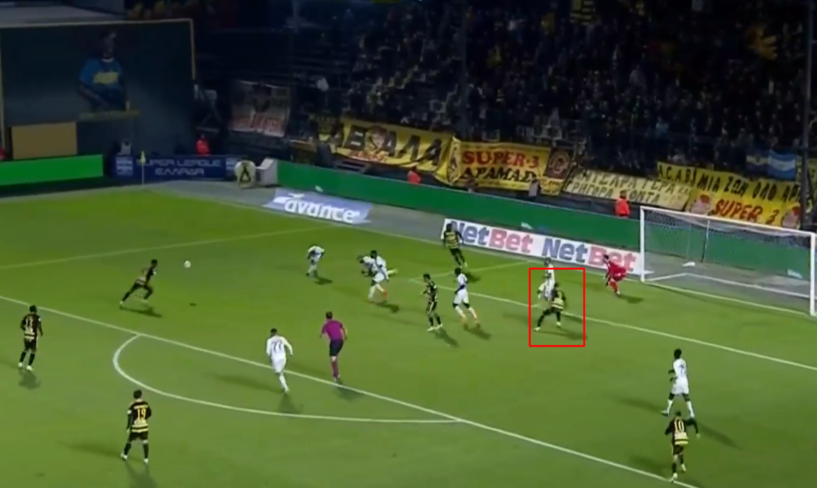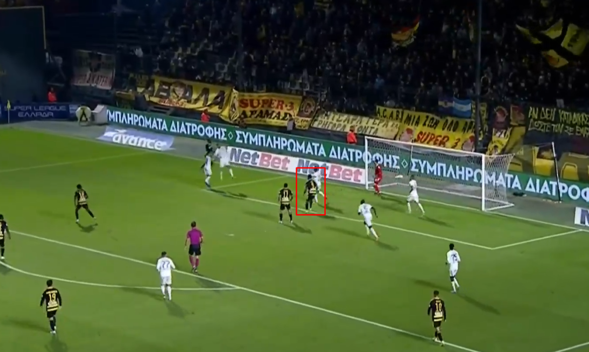 Ας πάρουμε για παράδειγμα το παιχνίδι με τον Ιωνικό και το γκολ του. Είναι ένα εύκολο γκολ, σίγουρα. Ας δούμε όμως όλη τη διάρκεια της φάσης, ντρίπλα Μόουζες, σέντρα Μόουζες, διεκδικήσιμη κεφαλιά Καμάτσο (πιθανή πάσα) και σέντρα Μαζικού. Σε όλες αυτές τις στιγμές κινείται στη γραμμή της μικρής περιοχής φροντίζοντας να μη βγαίνει offside αλλά ταυτόχρονα να έχει καλή τοποθέτηση.