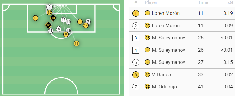Παρακάτω μπορείτε να δείτε την απεικόνιση του Wyscout με τις ευκαιρίες του Άρη μέσα στην περιοχή του Βόλου: