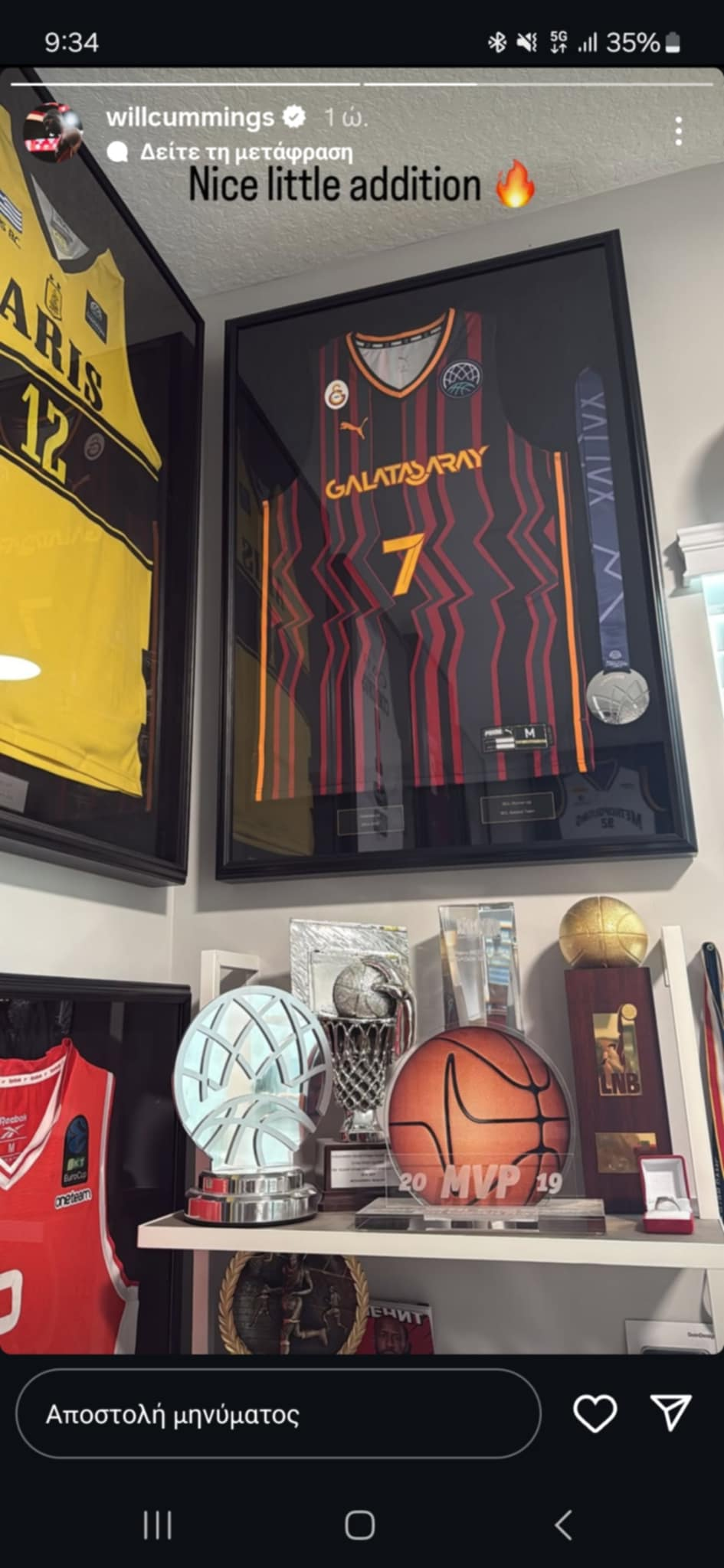 Ο ηγέτης της φιναλίστ του Basketball Champions League κορνίζαρε τη φανέλα της τούρκικης ομάδας, μαζί με το αργυρό μετάλλιο, όπως δημοσίευσε στο instagram.