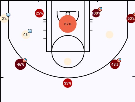 Άλλωστε είναι ένας από τους δύο μόλις παίκτες της Ιταλικής ομάδας που έχει διψήφιο αριθμό πόντων. Μάλιστα αυτό το πετυχαίνει έχοντας εξαιρετικά ποσοστά στα τρίποντα τη σεζόν, καθώς βρίσκεται στο 39%.