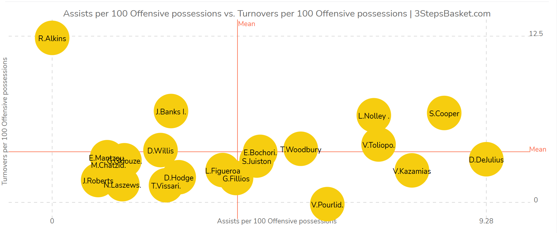 Κούπερ και Νόλεϊ ενώ είναι ψηλά στις ασίστ, είναι ταυτόχρονα ψηλά και στα λάθη, με τον Τολιόπουλο να ξεπερνάει λίγο τον μέσο όρο λαθών της ομάδας (4,5 ανά 100 κατοχές) έχοντας 7,5 ασίστ στο ίδιο διάστημα.