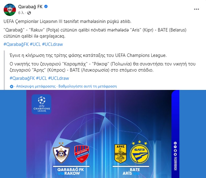 Στη φωτογραφία που έφτιαξαν για την κλήρωση οι Αζέροι έβαλαν το σήμα του Άρη Θεσσαλονίκης και όχι αυτό της Κυπριακής ομάδας.