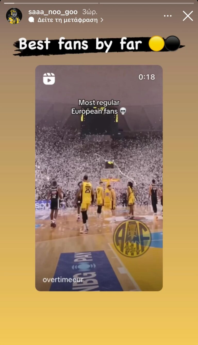 Ο φόργουορντ των «κιτρινόμαυρων» ανήρτησε ένα βίντεο από το «Nick Galis Hall» και το ντέρμπι με τον ΠΑΟΚ, αναφέροντας πως οι οπαδοί του Άρη είναι οι καλύτερη μακράν των δεύτερων.