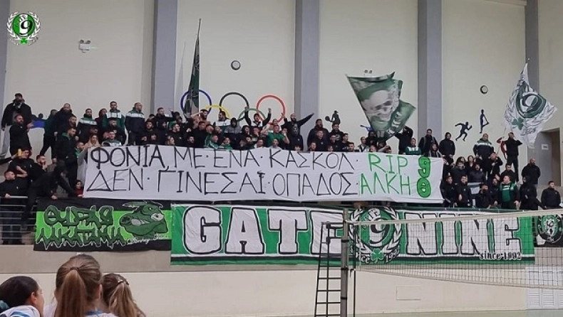 Πανό κρέμασαν οι οργανωμένοι οπαδοί της Ομονοίας κατά την διάρκεια αγώνα βόλεϊ, καταδικάζοντας τους φερόμενους ως δράστες στην δολοφονία του 19χρονου Άλκη: «Φονιά, με ένα κασκόλ δεν γίνεσαι οπαδός, RIP Άλκη».