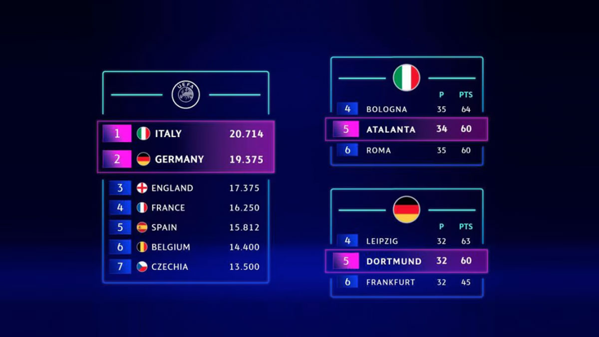 Η Ιταλία και η Γερμανία κράτησαν την διαφορά που είχαν αποκτήσει από την Αγγλία και χάρη στην φετινή απόδοση των συλλόγων τους, βγάζουν και 5ο εκπρόσωπο μέσω του πρωταθλήματος στο επόμενο Champions League.