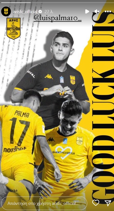 Σχετική ανακοίνωση έβγαλε και η ΠΑΕ Άρης, η οποία με σημερινή ανάρτησή της στα social media, ευχήθηκε καλή τύχη στον 23χρονο ποδοσφαιριστή.