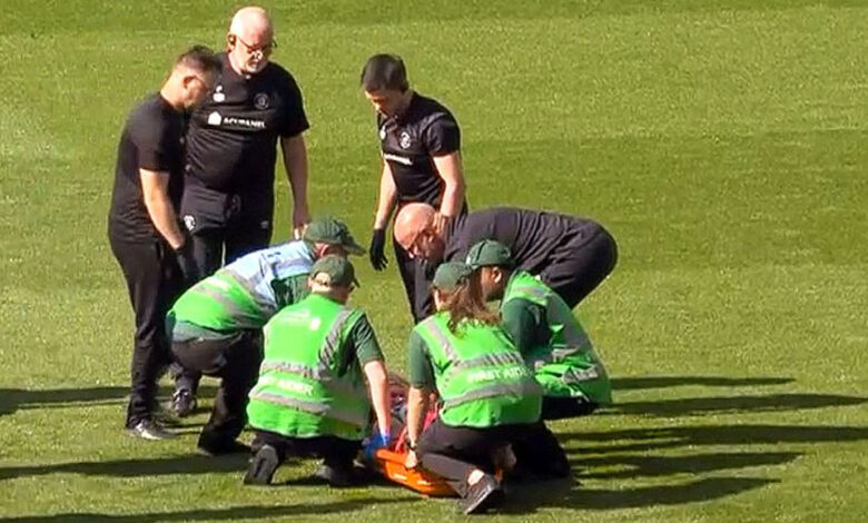 Ο αρχηγός της Λούτον στο δέκατο λεπτό του παιχνιδιού, κατέρρευσε με το ιατρικό επιτελείο να σπεύδει στο σημείο για να εξακριβώσει το τι συνέβη.