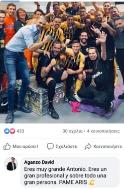 Ο Ισπανός άφησε σχόλιο κάτω από την φωτογραφία με το «αντίο» του φίλου του Αντώνη στο Facebook λέγοντας: «Είσαι πολύ μεγάλος Αντώνη, ένας μεγάλος επαγγελματίας και πάνω απ’ όλα ένας μεγάλος άνρθωπος. ΠΑΜΕ Άρης!»