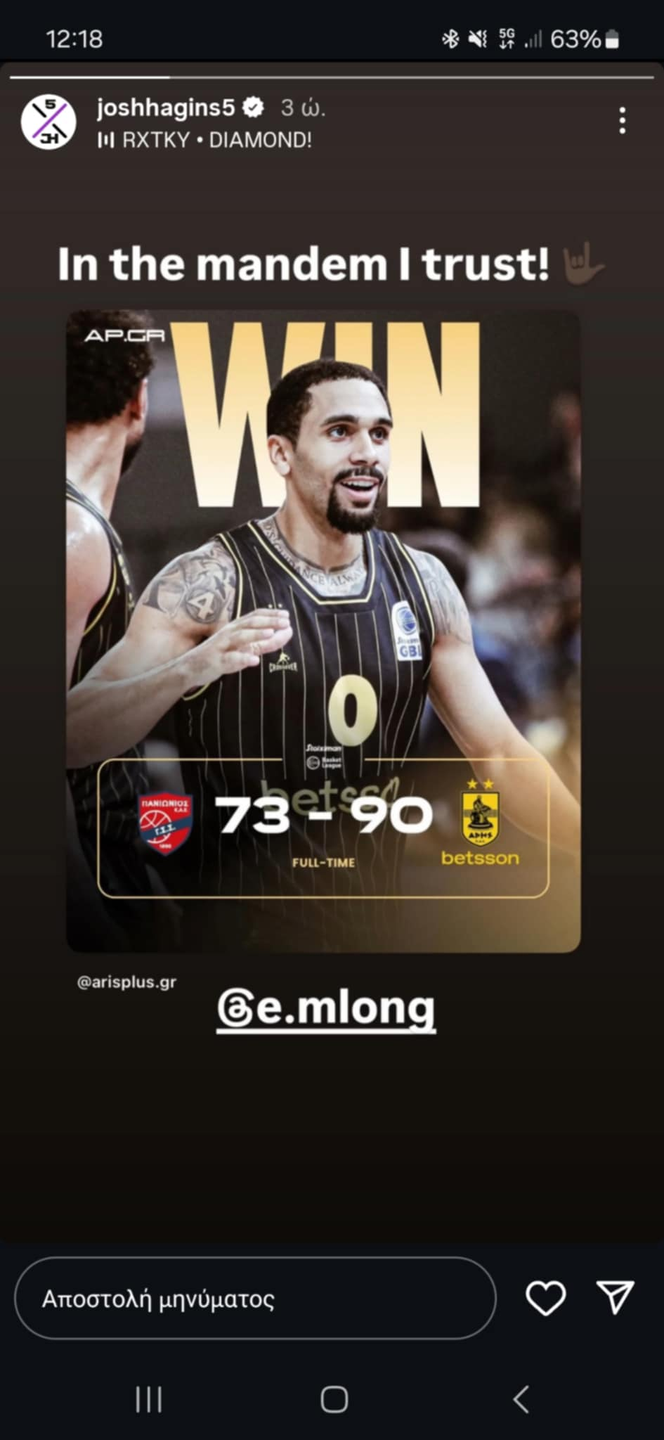 Ο Αμερικάνος πανηγύρισε τη νίκη των «κιτρινόμαυρων», δημοσιεύοντας ένα στόρι στο instagram, με κεντρικό πρόσωπο τον άλλοτε συμπαίκτη του, Ελάιζα Μήτρου-Λονγκ.