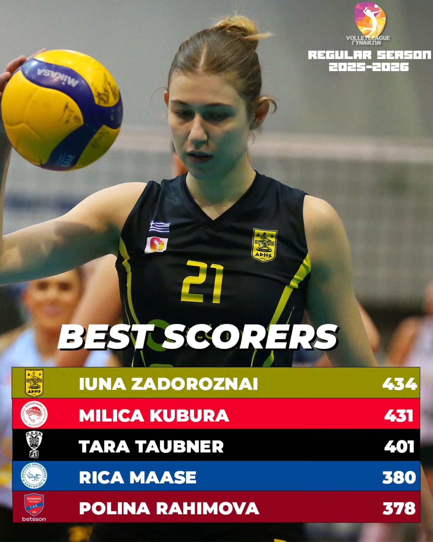 Η διαγώνια του Άρη, Ιούνα Ζαντοροζνάι αναδείχθηκε πρώτη σκόρερ του πρωταθλήματος της Volley League γυναικών.