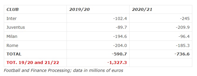 Η ιστοσελίδα «Calcio e finanza» εστιάζει στους τέσσερις «μεγάλους» της Ιταλίας, Γιουβέντους, Ίντερ, Μίλαν και Ρόμα, και αναφέρει πως έχουν χάσει συνολικά 1,3 δισεκατομμύρια ευρώ την τελευταία διετία! Μιλάμε για τεράστιο ποσό που δύσκολα αναπληρώνεται.