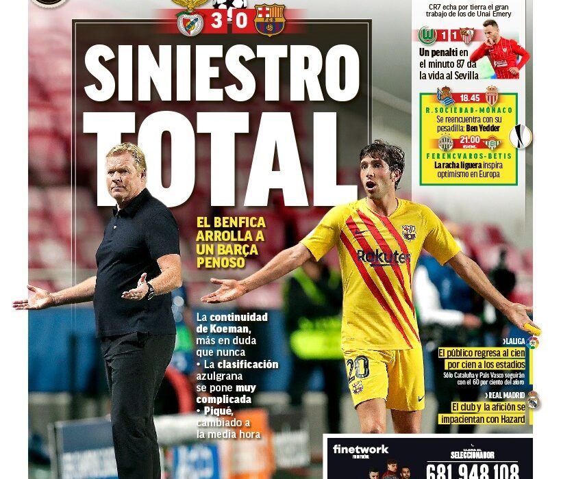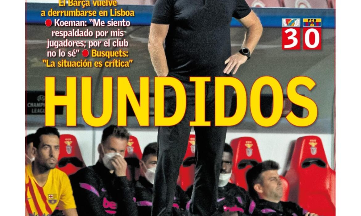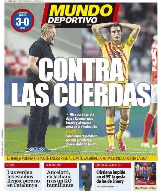 Η εφημερίδα «Marca» δεν… χαρίζεται στους Καταλανούς και χαρακτηρίζει ως «απαίσια» την εμφάνιση τους κόντρα στην Μπενφίκα. Η «AS», από την πλευρά της αναφέρει ότι η Μπαρτσελόνα «βυθίζεται», ενώ ο τίτλος από το πρωτοσέλιδο της «Mundo Deportivo» είναι: Κόντρα στα σκοινιά» για το μέλλον του Κούμαν.