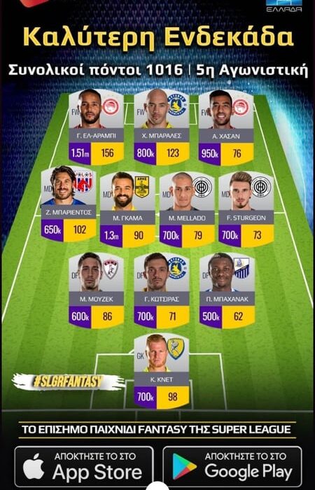 Ο Μπρούνο Γκάμα κέρδισε μια θέση στην καλύτερη ενδεκάδα της 5ης αγωνιστικής στο επίσημο παιχνίδι της Super League, Fantasy.