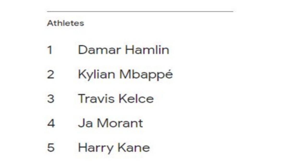 Πρώτος είναι ο Νταμάρ Χάμλιν από το NFL, δεύτερος ο Κιλιάν Εμπαπέ, τρίτος ο Τράβις Κέλτσε (NFL), σύντροφος της τραγουδίστριας, Tέιλορ Σουίφτ και τέταρτος είναι ο Τζα Μοράντ που βρίσκεται μια θέση πάνω από τον Χάρι Κέιν, που συμπληρώνει την πρώτη πεντάδα των αθλητών που αναζητήθηκαν μέσω της Google κατά το έτος 2023. Δείτε…