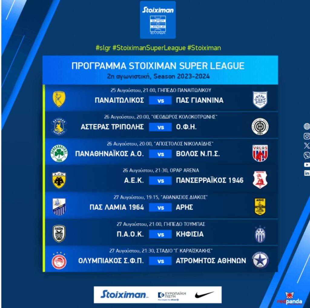 Το πρόγραμμα για τη 2η αγωνιστική ανακοίνωσε η Stoiximan Super League το πρωί της Κυριακής.
