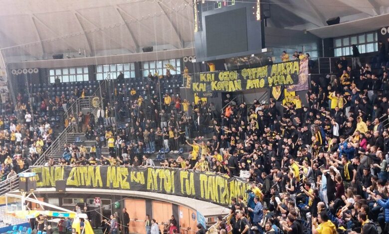 Δύο ξεχωριστά πανό υπήρχαν στο πέταλο του Παλέ. “Οσοι έφυγαν μακριά και κοιτούν από ψηλά…” ήταν το ένα πανό και το άλλο έγραφε μεταξύ άλλων “είναι δίπλα μας”. Αυτά τα πανό αφορούσαν τους φίλους του Άρη που “έφυγαν” από την ζωή.
