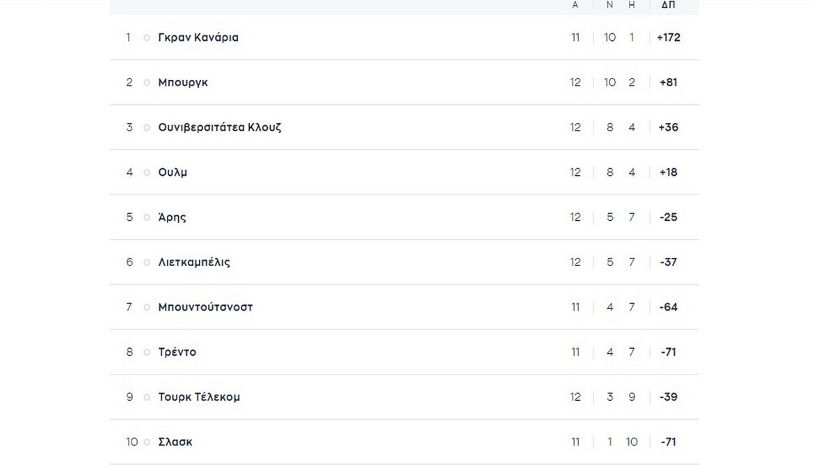 Ο Άρης πήρε μεγάλο διπλό αλλά καλό θα ήταν το αποτέλεσμα στη Λιθουανία να ήταν… αλλιώς. Αυτό το λέμε γιατί δεν βόλεψε η νίκη της Λιετκαμπέλις επί της Ουλμ με 94-90. Από εκεί και πέρα η Κλουζ ήταν κάκιστη και έχασε εντός έδρας από την Μπουργκ με 89-98. Ακόμη, δεν έχει ξεκινήσει ο αγώνας της Γκραν Κανάρια με την Τρέντο, στην Ισπανία. Oπότε, η βαθμολογία είναι δίχως αυτό το ματς.