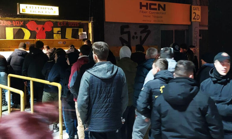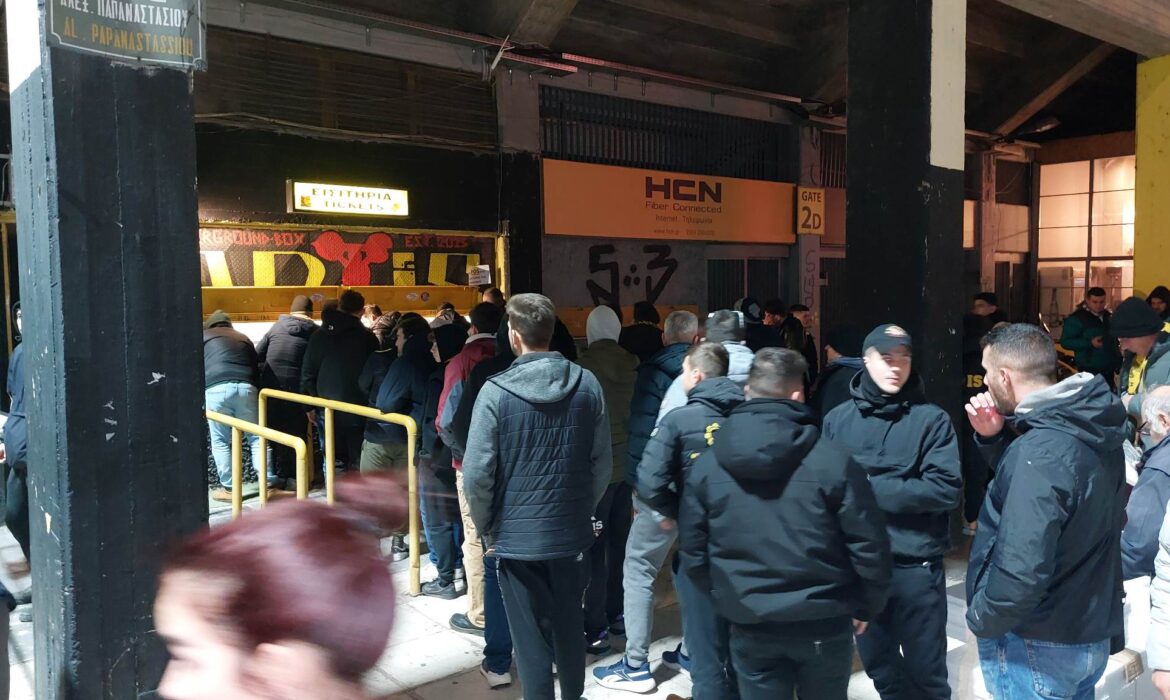 Πολύς κόσμος βρίσκεται έξω από το γήπεδο για το ματς με τον Ολυμπιακό. Μάλιστα, έχουν σχηματιστεί ουρές στα εκδοτήρια, με τους φίλους του Άρη να περιμένουν να προμηθευτούν τα εισιτήρια τους.