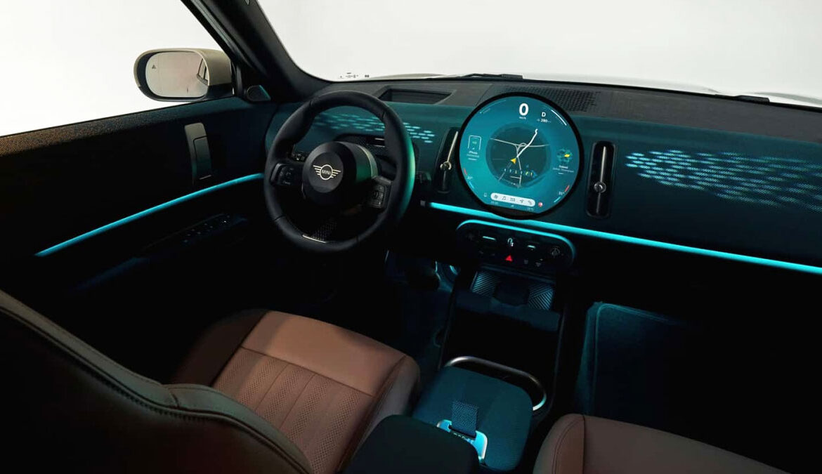 Όπως συμβαίνει και με το εξίσου νέο MΙΝΙ Cooper, το Countryman διαθέτει ένα κυκλικό, κυρτό ταμπλό καλυμμένο με υφασμάτινες επιφάνειες σε ορισμένα επίπεδα εξοπλισμού. Αναμφίβολά, το μάτι κερδίζει η στρογγυλή κεντρική οθόνη OLED 9,44 ιντσών, εντός της οποίας ενσωματώνονται πολλές χρηστικές πληροφορίες, από την ταχύτητα ταξιδιού, μέχρι το σύστημα πλοήγησης, αλλά και την κατάσταση της μπαταρίας.