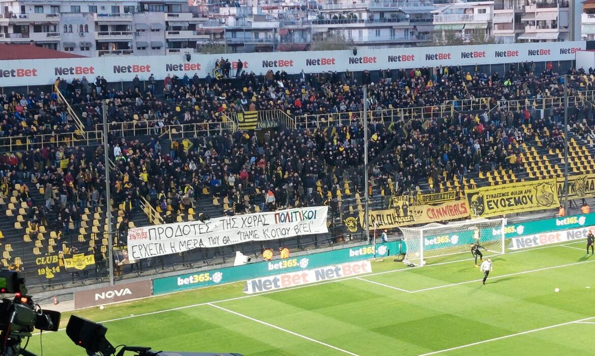 Ανάμεσα σε άλλα πανό, που βρίσκονται στις κερκίδες, υπάρχει και ένα για τους πολιτικούς. Φίλοι του Άρη έστειλαν ένα ξεχωριστό μήνυμα, ανεβάζοντας το παρακάτω πανό.