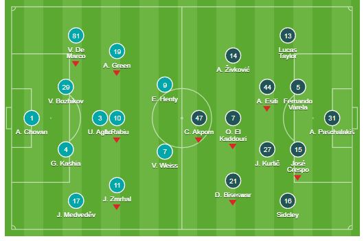 Στα αριστερά έπαιξε ο Σίντκλεϊ αντί του Ροντρίγκο που είχε αγωνιστεί στο ματς της περασμένης Κυριακής. Ο Κούρτιτς χρησιμοποιήθηκε και σήμερα (όπως και κόντρα στον αθηναϊκό σύλλογο) ενώ ο Εσίτι αγωνίστηκε αντί του Σβαμπ που είχε παίξει με τον Ατρόμητο. Ζίβκοβιτς, Μπίσεσβαρ και Ελ Καντουρί έπαιξαν πίσω από τον Άκπομπ. Οι τέσσερις τελευταίοι είχαν αγωνιστεί βασικοί και στο ματς με τον Ατρόμητο.