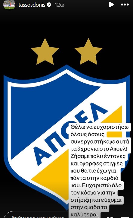 Ποστάρισμα… αποχαιρετισμού στο ΑΠΟΕΛ στα social media από τον Τάσο Δώνη, ο οποίος θα συνεχίσει την καριέρα του στον Άρη.