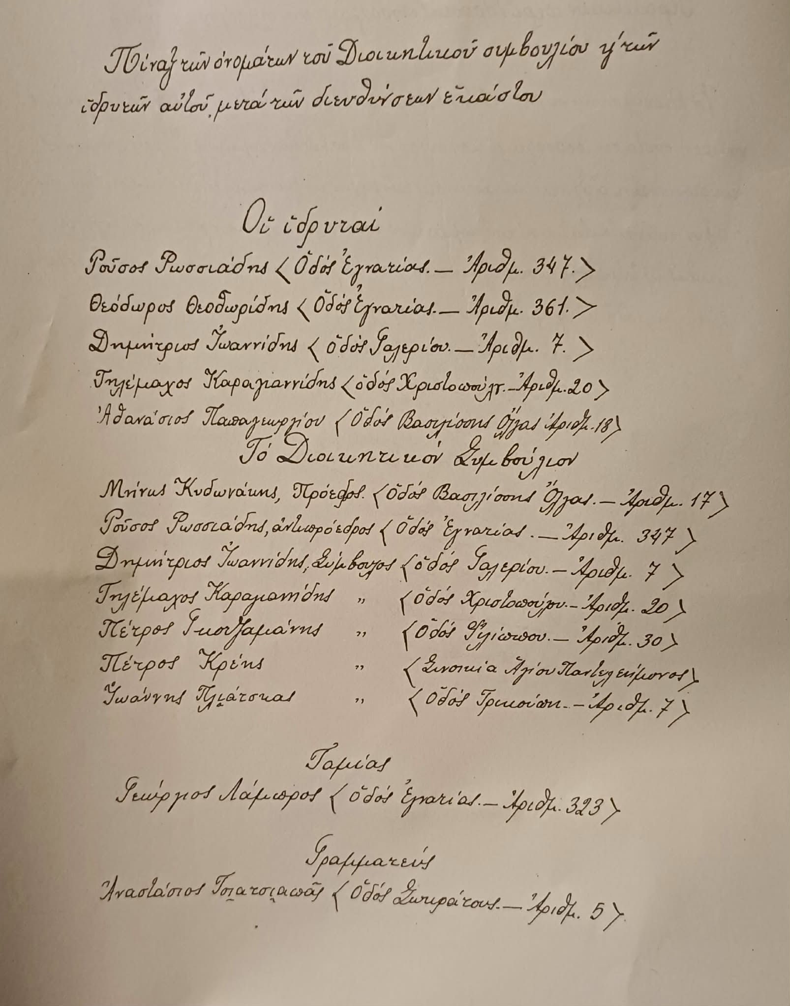 Παρακάτω ο πίνακας των ονομάτων του πρώτου Διοικητικού Συμβουλίου του, των ανθρώπων που θεμελίωσαν το όραμα της δημιουργίας ενός τεράστιου πολυαθλητικού συλλόγου βασισμένου στις αξίες και την ηθική: