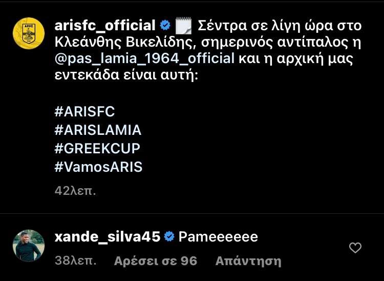Ο Σάντε Σίλβα στηρίζει τον Άρη στο ματς Κυπέλλου με την Λαμία και το έδειξε διαδικτυακά… Κάτω από την ανάρτηση της ΠΑΕ για το σημερινό ματς, ο Πορτογάλος έγραψε “πάμε…”, θέλοντας να δείξει πως θέλει νίκη απέναντι στη Λαμία.