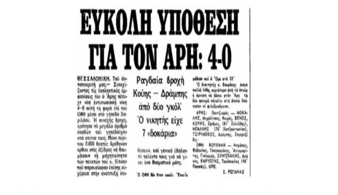 Ο Άρης στις 15.00 υποδέχεται τον ΟΦΗ και με αφορμή το σημερινό ματς, ας γυρίσουμε τον χρόνο πίσω σε ένα ματς μεταξύ των δύο ομάδων που έμεινε στην ιστορία. Ήταν αρχές Νοέμβρη του 1980 όταν οι κίτρινοι επικρατούσαν εντός έδρας του ΟΦΗ με 4-0, με δύο τέρματα από Κούη και Δράμπη. Ως εδώ όλα φυσιολογικά…