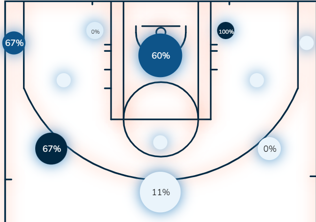 Ακόμη είχε 6/10 σουτ μέσα στο ζωγραφιστά, ενώ επιχείρησε μόλις δύο σουτ από το mid range ευστοχώντας σε ένα από αυτά και αστοχώντας στο δεύτερο.