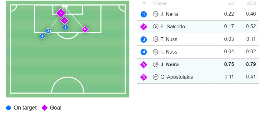 Αντίστοιχα ο Μάικιτς έχει δεχθεί 4 τέρματα με 3,3 expected goals against και ο Αθανασιάδης 2 τέρματα με 1,63 goals against.