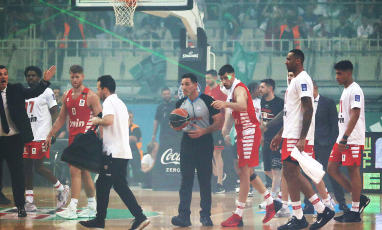 Έμεναν 2:46 για το τέλος της τρίτης περιόδου στο Game 4 της σειράς των τελικών της Basket League, όταν καπνογόνα στις εξέδρες και αντικείμενα προς τον πάγκο του Ολυμπιακού οδήγησαν στη διακοπή της αναμέτρησης και στην αποχώρηση των ερυθρόλευκων στα αποδυτήρια.
